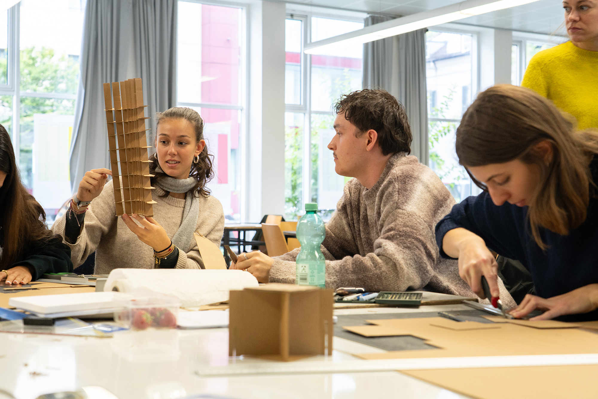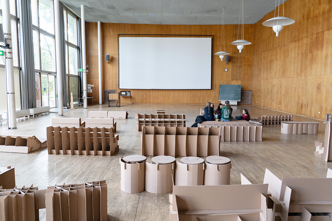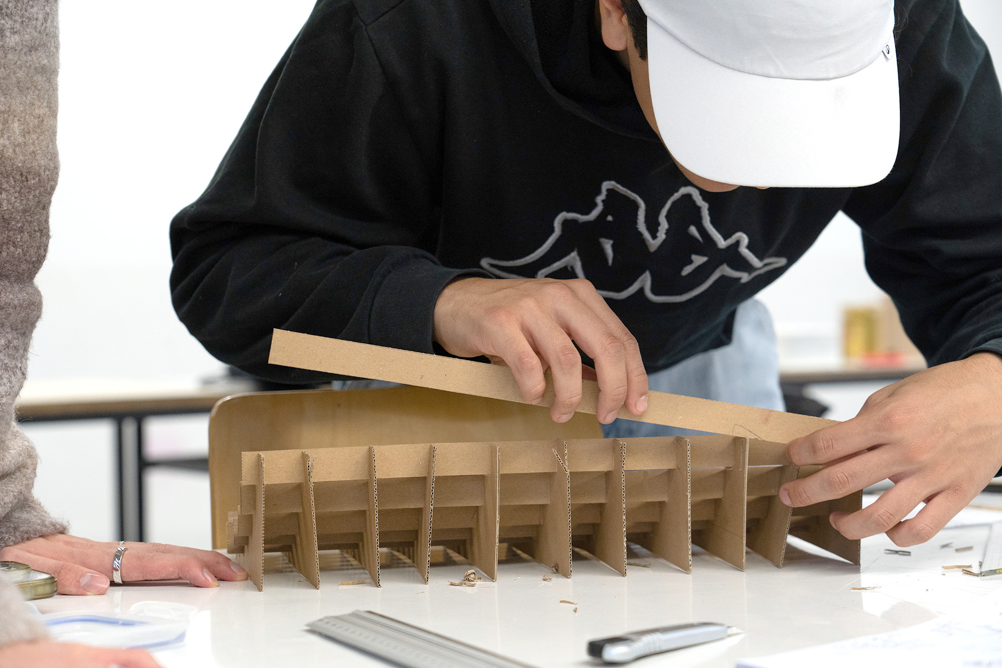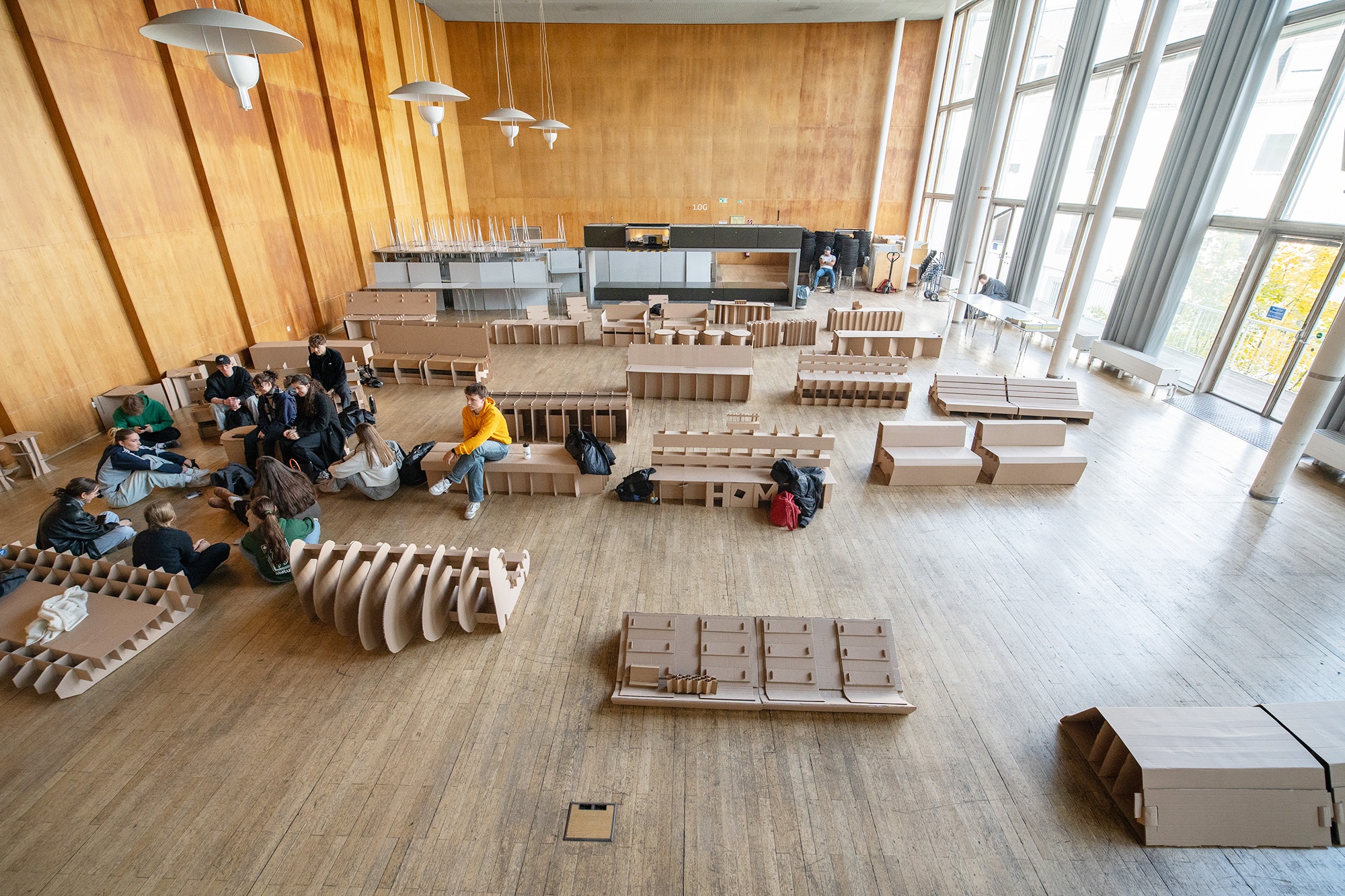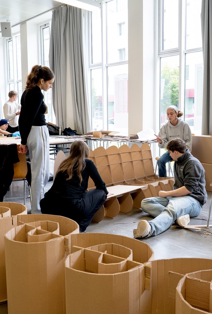 Als Einführungsaufgabe haben die Erstsemester-Studierenden schon gleich einen konkreten gestalterischen Entwurf – Objekte zum Verweilen – umsetzen dürfen. Während des viertätigen Workshops konzipierten und bauten sie, aufgeteilt in Kleingruppen von drei bis fünf Personen, eine Sitzgelegenheit für vier Personen. Nachdem im ersten Teil des Workshops zuerst Skizzen und Kleinmodelle angefertigt wurden, setzten die Studierenden im zweiten Teil ihre Entwürfe als 1:1 Modelle aus Wellpappe um und präsentieren sie anschließend im Rahmen einer Ausstellung.