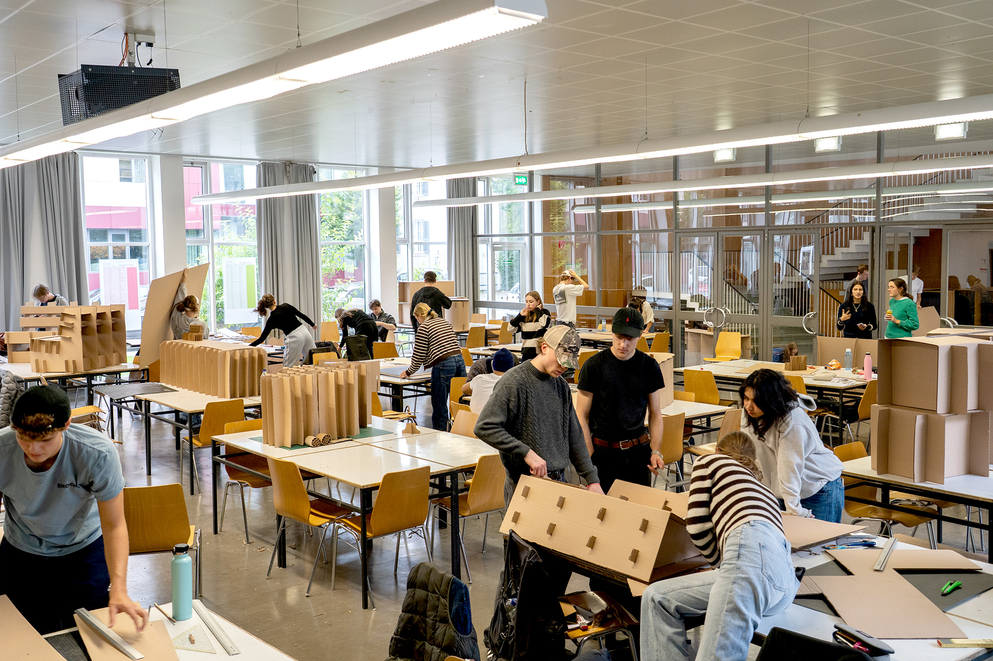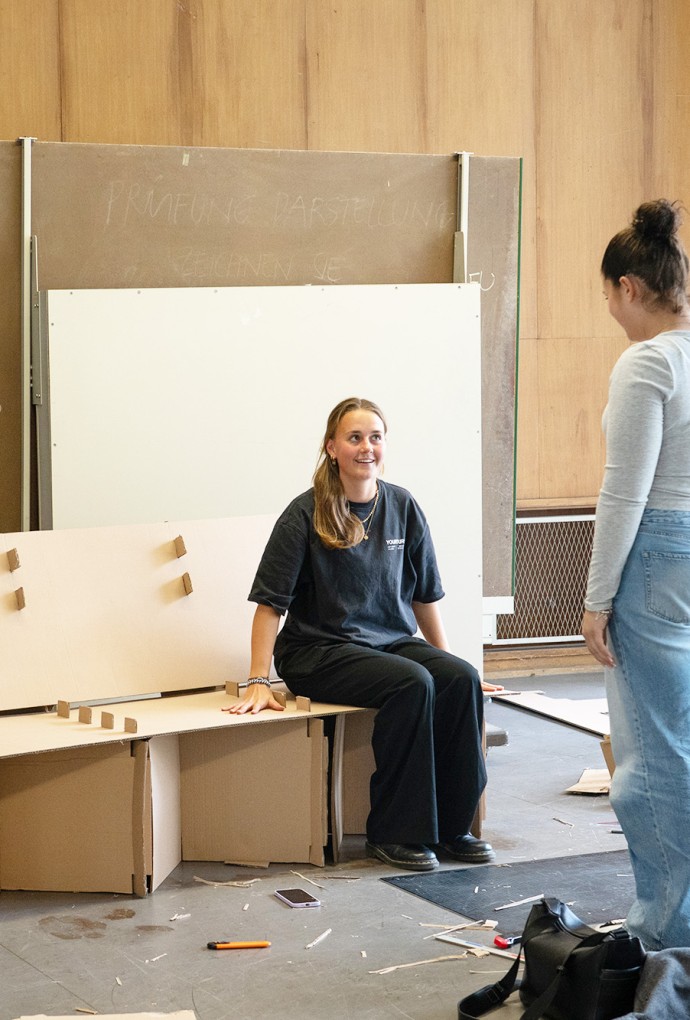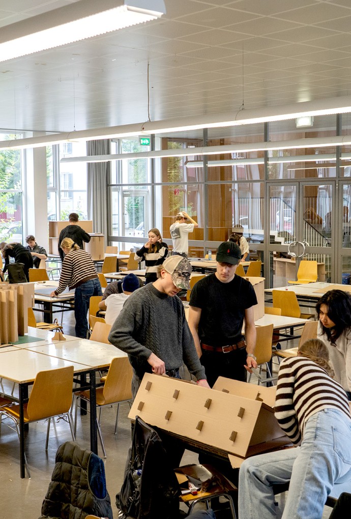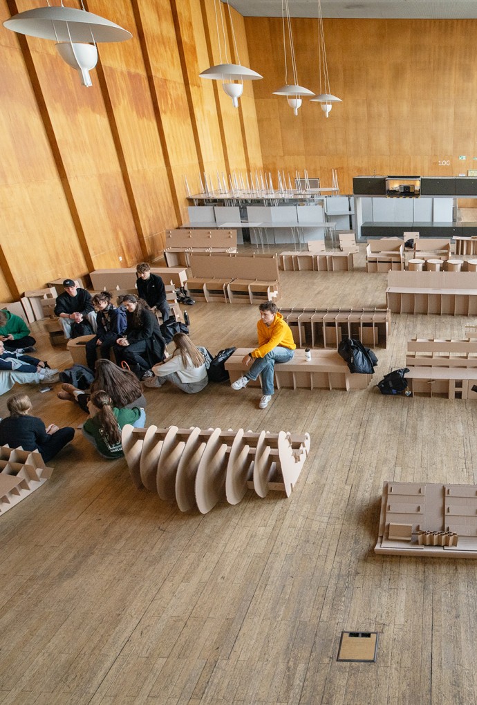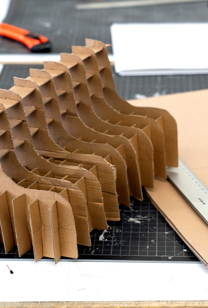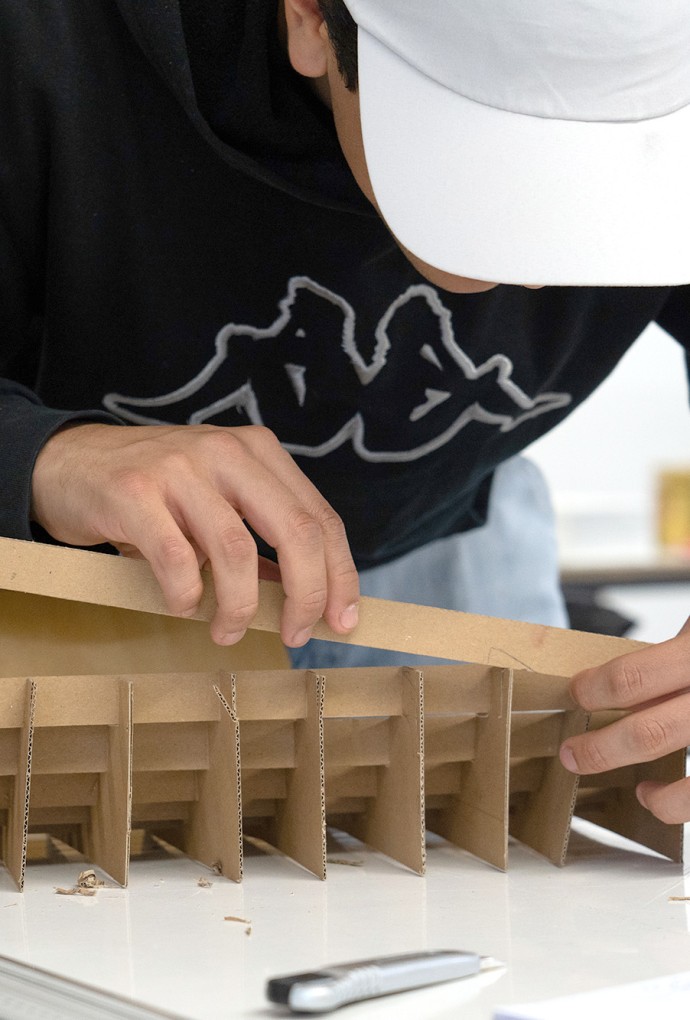 Als Einführungsaufgabe haben die Erstsemester-Studierenden schon gleich einen konkreten gestalterischen Entwurf – Objekte zum Verweilen – umsetzen dürfen. Während des viertätigen Workshops konzipierten und bauten sie, aufgeteilt in Kleingruppen von drei bis fünf Personen, eine Sitzgelegenheit für vier Personen. Nachdem im ersten Teil des Workshops zuerst Skizzen und Kleinmodelle angefertigt wurden, setzten die Studierenden im zweiten Teil ihre Entwürfe als 1:1 Modelle aus Wellpappe um und präsentieren sie anschließend im Rahmen einer Ausstellung.