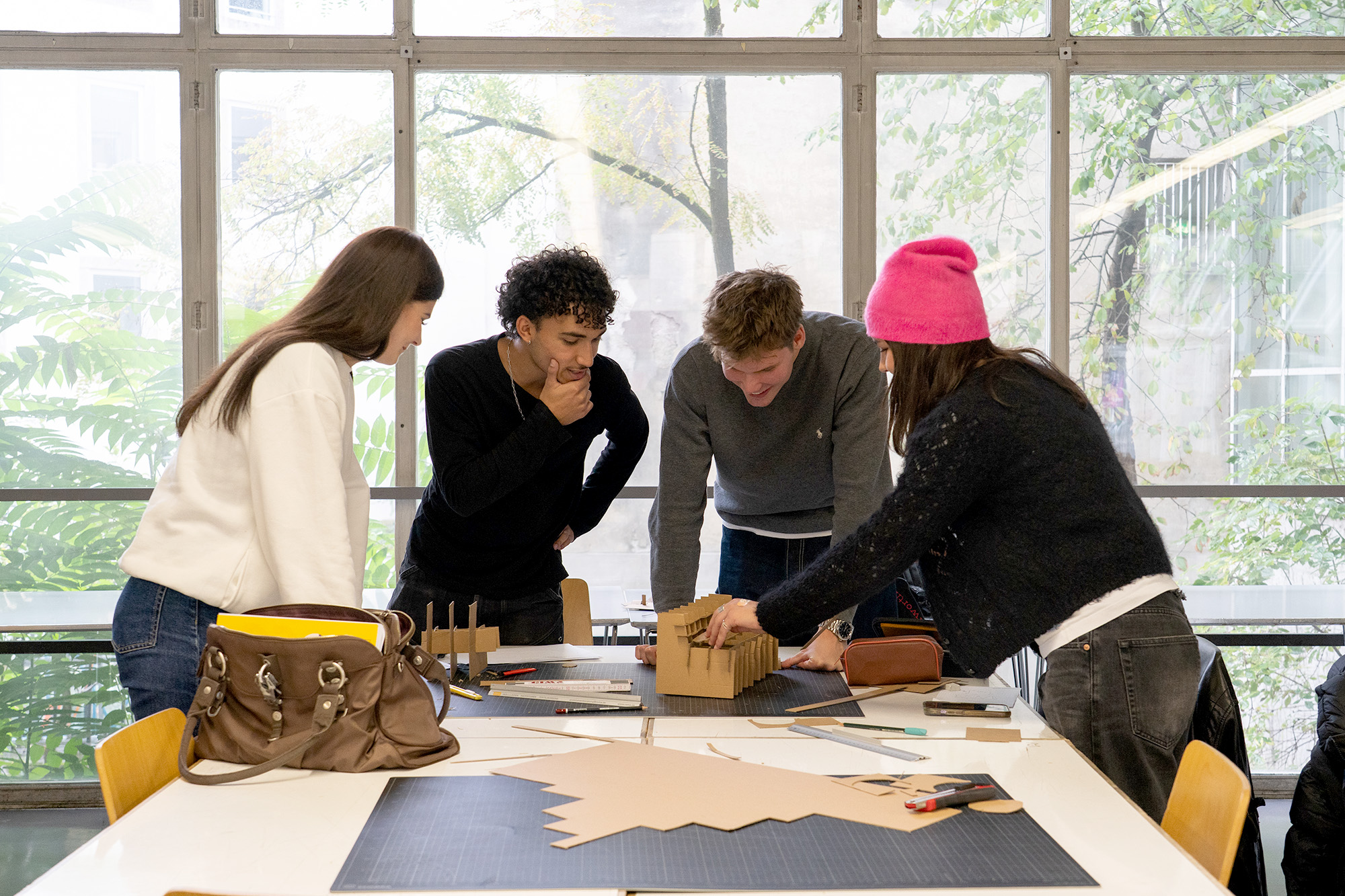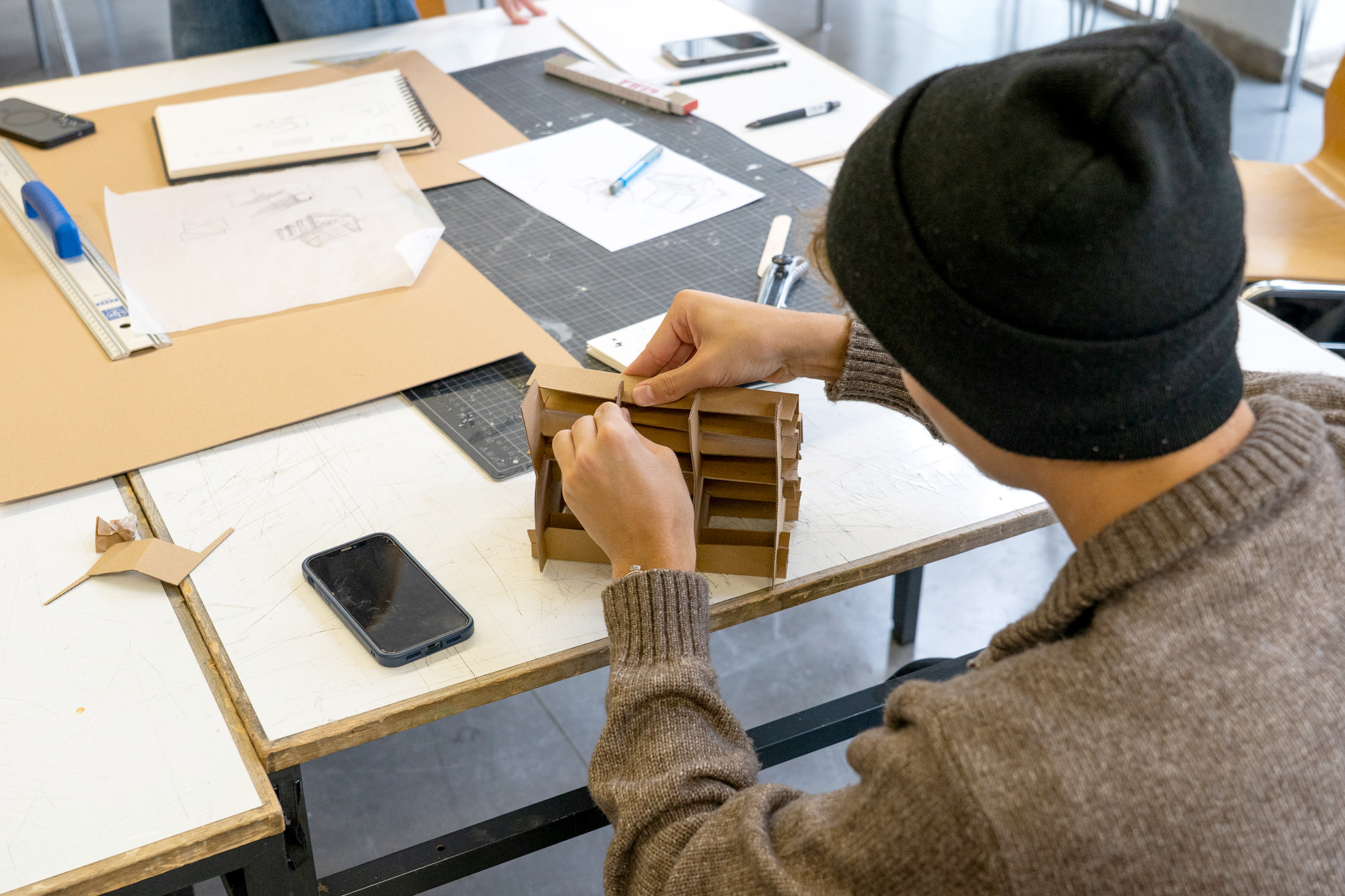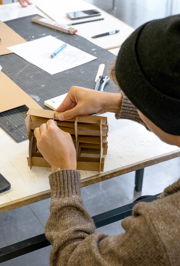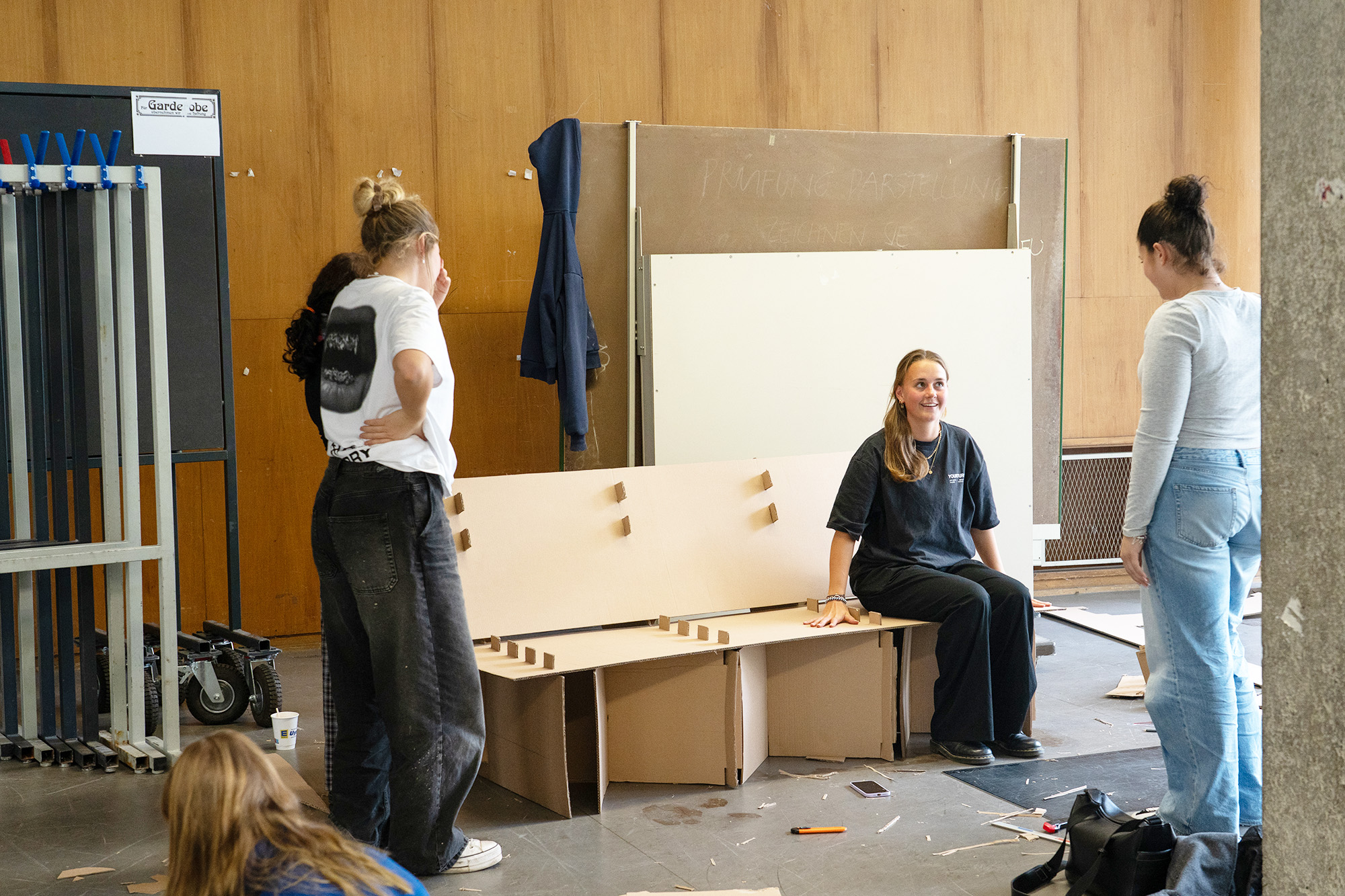 Als Einführungsaufgabe haben die Erstsemester-Studierenden schon gleich einen konkreten gestalterischen Entwurf – Objekte zum Verweilen – umsetzen dürfen. Während des viertätigen Workshops konzipierten und bauten sie, aufgeteilt in Kleingruppen von drei bis fünf Personen, eine Sitzgelegenheit für vier Personen. Nachdem im ersten Teil des Workshops zuerst Skizzen und Kleinmodelle angefertigt wurden, setzten die Studierenden im zweiten Teil ihre Entwürfe als 1:1 Modelle aus Wellpappe um und präsentieren sie anschließend im Rahmen einer Ausstellung.